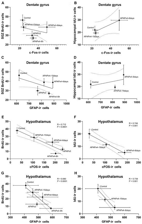 Correlation analysis between cell proliferation, assessed by the number of 5′-bromo-2′-deoxyuridine immunoreactivity (BrdU-ir) cells; cell survival, assessed by the number 5′-iodo-2′-deoxyuridine immunoreactivity (IdU-ir) cells; neuronal activity, assessed by the number of c-Fos immunoreactivity (c-Fos-ir) cells; and astroglia, assessed by the number of glial fibrillary acidic protein immunoreactivity (GFAP-ir) cells, in the hippocampus (A–D) and hypothalamus (E–H) of mice that received saline (control group) or acetaminophen (APAP) at a dose of 750 mg/kg for 3 and 4 consecutive days and that were sacrificed 6 h (APAPx3 and APAPx4–6 h groups), 6 days (APAPx4–6 days group), and 15 days (APAPx4–15 days group) after the last administration. The scatter (XY) plots represent the means ± standard error of the mean (SEM) (N = 6 per experimental group). Plotted (solid) lines between mean points represent the correlative changes between the two variables represented. Dashed lines represent error of the plotted lines. Rho values (goodness-of-fit) were calculated. A p-value less than 0.05 indicates the statistical significance of the correlation.