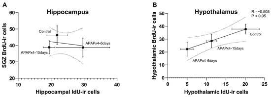 We finally analyzed whether changes in cell proliferation in the neurogenic zones are related to changes in cell survival in the hippocampus and hypothalamus after repeated APAP administration. The results indicated that the number of SGZ BrdU-ir cells did not correlate with the number of hippocampal IdU-ir cells (Figure 8A). However, in the hypothalamus, a significant correlation between the number of BrdU-ir cells and the number of IdU-ir cells was found (R = −0.503, F1,16 = 5.430, p < 0.05) when the control, APAPx4–6 days, and APAPx4–15 days groups were analyzed (Figure 8B).
