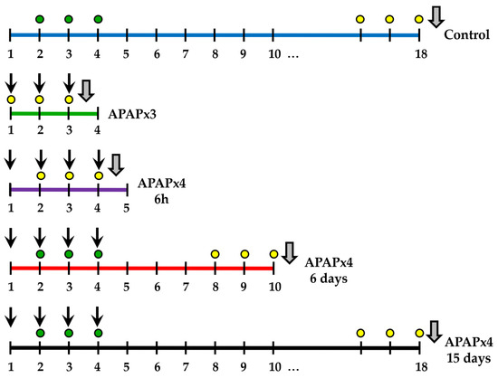 Schematic timeline and experimental groups of repeated administration of acetaminophen (APAP) at a dose of 750 mg/kg/day for 3 (green line) or 4 (purple line) consecutive days and cessation of APAP administration for 6 (red line) or 15 (black line) consecutive days. Black arrow: APAP administration; gray arrow: sacrifice; yellow circle: 5′-bromo-2′-deoxyuridine immunoreactivity (BrdU) administration (50 mg/kg/day); green circle: 5′-iodo-2′-deoxyuridine immunoreactivity IdU administration (42.75 mg/kg/day).