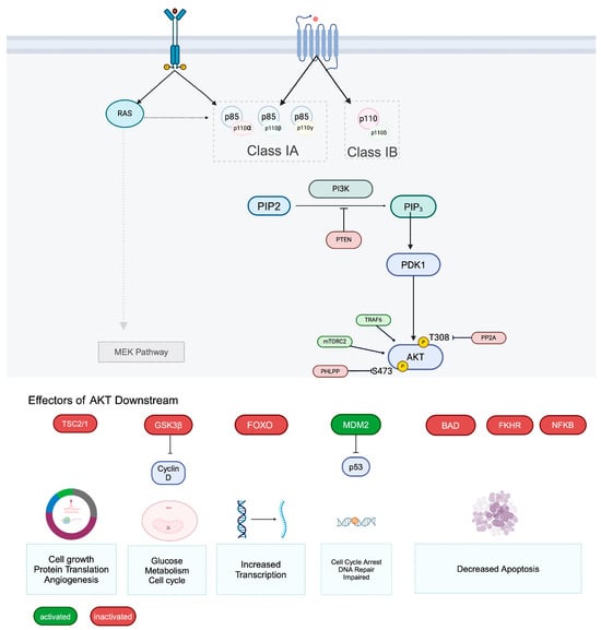 Activated PI3K then phosphorylates phosphatidylinositol 4,5-bisphosphate (PIP2) at the plasma membrane to phosphatidylinositol (3,4,5)-trisphosphate (PIP3). Increased PIP3 concentration at the plasma membrane leads to the recruitment of proteins containing PIP3 binding PH domains such as PDK1 (Pyruvate Dehydrogenase Kinase 1) and AKT kinases []. PDK1 contains a PH domain that has a high affinity for PIP3 and becomes active upon binding PIP3 to its PH domain, leading to the phosphorylation at the serine 241 residue, and the activation of AKT via phosphorylation at the threonine 389 residue []. Additionally, PDK1 can indirectly activate AKT via the activation of mTORC2, which activates AKT by binding to the serine 473 residue []. Activated AKT then phosphorylates downstream effector proteins including mTOR complexes as well as FOXO (Forkhead box) transcription factors that regulate cell survival and cell cycle progression [,]. However, the duration of PIP3 activity is short due to the antagonizing mechanism by PTEN and other lipid phosphatases []. Figure 1 summarizes the PI3K pathway activation.