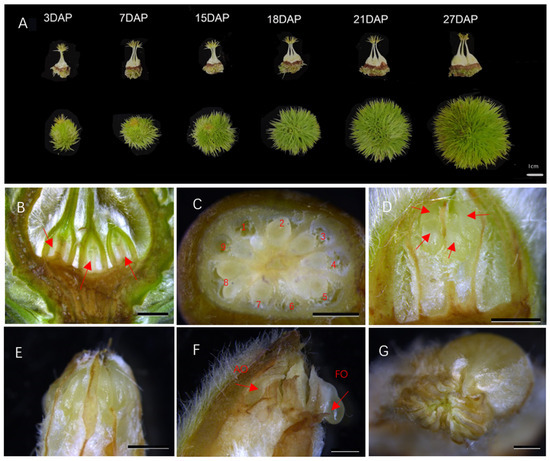 C. mollissima ‘Dongling’ trees that were 15 years old. In the treatment groups, the plants were either bagged without pollination or subjected to full artificial pollination during the flowering stage. Ten trees were included in each treatment group, and 50 burs were selected from each tree. For the group subjected to bagging without pollination, the female flower clusters were covered with sulfuric acid paper bags on June 3 to isolate pollen, and the bags were removed when pollination of the male inflorescences in the chestnut garden was completed. To achieve adequate manual pollination, artificially assisted pollination was carried out on June 15 when the stigmas were tilted at 30°–45° (optimal pollination period), and freshly collected mixed pollen and inactivated pollen (exposed to 4 h of ultraviolet light) were gently applied onto the stigmatic clusters of bagged female flowers using a brush at 11:00 AM. This process was repeated at the same time the next day to ensure thorough pollination [