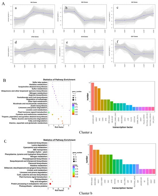 In this study, by sequencing the transcriptomes of chestnut ovules at different developmental stages after pollination, a total of 123.15 Gb of high-quality clean reads were obtained, with Q30 > 91.54%, which met the requirements for subsequent analysis. To analyze the DEG patterns in chestnuts during pollination and fertilization, the transcriptome data of ovules at different developmental stages were pooled, normalized, and subsequently clustered via K-means. Based on the gene expression patterns, the DEGs in ovules at different developmental stages could be categorized into six clusters. A total of 952 DEGs that were significantly up-regulated (cluster a) and 556 DEGs that were significantly down-regulated (cluster b) were analyzed. Subsequently, transcriptome and metabolome sequencing and analysis of fertile and abortive ovules from three developmental stages were performed, and the pathway enrichment results for the DEGs and DAMs of fertile and abortive ovules from the three developmental stages were basically consistent with the transcriptome data obtained during pollination and fertilization. These findings indicate that the DEGs enriched in these metabolic pathways play important roles in the development of chestnut ovules and that further research should be carried out on these pathways in the future.