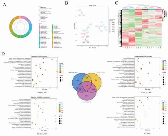 Metabolites that were significantly differentially expressed across the groups were indicated by both an absolute log2 (fold change, FC) greater than 1 and a variable importance in projection (VIP) greater than or equal to 1. The VIP values, taken from the OPLS-DA findings that included score plots and permutation plots, were produced using the R package MetaboAnalystR. Prior to conducting OPLS-DA, the data were log-transformed (log2) and mean-centered. To avoid overfitting, a permutation test with 200 iterations was performed. The identified metabolites were annotated using the KEGG Compound database (