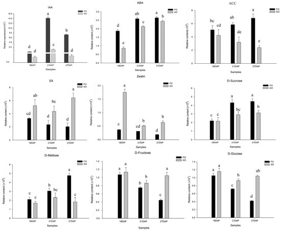 Ovules were selected at 18 (18FO, 18AO), 21 (21FO, 21AO), and 27 (27FO, 27AO) DAP for widely targeted metabolomic assays. Sample preparation, extract analysis, metabolite identification, and quantification were performed at Wuhan MetWare Biotechnology Co., Ltd. (Wuhan, China) (