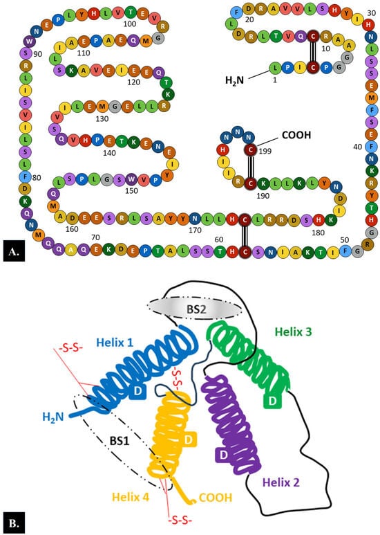 Structure of the prolactin (PRL) molecule. (A). The 199 amino acid chain. There are three intramolecular disulfide bonds between six cysteine residues in the human prolactin chain: Cys4–Cys11, Cys58–Cys174, and Cys191–Cys199. (B). The tertiary structure. Each PRL molecule contains four α-helical domains (D) and two binding sites (BSs) (BS1 involves helices 1 and 4, while BS2 encompasses helices 1 and 3) [,]. Loops between the helices and three intermolecular disulfide bonds between six cysteine residues are also marked.