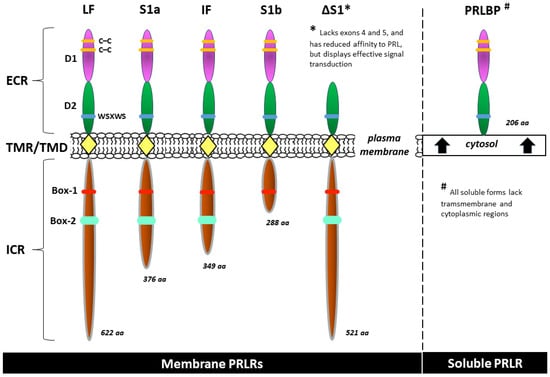 Intermediate and various short forms result from alternative splicing, variable promoter usage, or other posttranscriptional (but unlikely) posttranslational modifications. Sequences from exon 11 are present only in the short forms of the receptor S1a and S1b and their respective variants [,]. Although many PRLR isoforms perform the same or similar biological roles, some of these isoforms have unique functions. Moreover, human PRLRs are located not only in the cell membrane but also in the cytosol (a soluble isoform) and, surprisingly, in cellular structures such as endosomes, the Golgi apparatus, and lysosomes (here, they are presumably a degraded form of the receptor) [,,]. All of the soluble forms of the PRLR lack transmembrane and cytoplasmic regions [,]. The most common isoforms of the human PRLR are included in Figure 2.