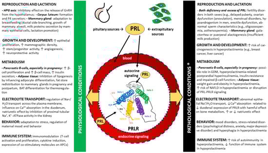 A simplified overview of the diverse functions of the prolactin receptor (PRLR) signaling through endocrine and autocrine prolactin (PRL) binding in normal and pathological conditions (marked with yellow arrows, respectively) related to the functioning of the hypothalamic–pituitary–gonadal (HPG) axis [,,,,,,], growth and development [,,,,,,,,], metabolism [,,,,,,,,,,,,,,,], electrolyte transport [,,,], behavior [,,,,] and immune system [,,,]. ↑—increase, ↓—decrease, APC—antigen-presenting cells, BAT—brown adipose tissue, GDM—gestational diabetes mellitus, GnRH—gonadotropin-releasing hormone (gonadoliberin), NAFLD—non-alcoholic fatty liver disease, P4—progesterone. * Associated with both hyper- and hypoprolactinemia and disorders of PRLR expression/function. In contrast to hyperprolactinemia, the most common cause of which is a prolactinoma, in the vast majority of cases of hypoprolactinemia, the deficiency occurs secondary to general anterior pituitary dysfunction, as is the case in Sheenan’s syndrome (a postpartum necrosis of the pituitary gland). Isolated hypoprolactinemia is rare, and it may have a genetic component (i.e., familial puerperal alactogenesis).