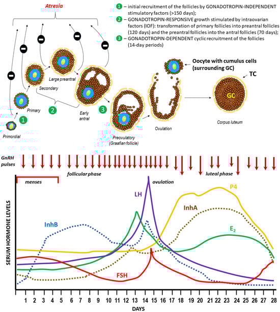 A pool of ovarian follicles, numbering approx. 150,00–200,000 (in one ovary) during a woman’s puberty, is subject to recruitment and selection processes leading to the development of the dominant Graafian follicle, which undergoes ovulation [,,]. It is worth noting that while the cyclical, gonadotropin-dependent recruitment of the early antral follicles takes place over 14-day periods (follicular phase), reaching this stage through the earlier stages of folliculogenesis (gonadotropin-independent in the case of primordial follicles and gonadotropin-responsive in the case of secondary follicles) takes much longer. The initiation of the menstrual cycle during puberty and its subsequent course are determined by the variable, pulsatile secretion of gonadoliberin (GnRH–gonadotropin-releasing hormone) from the hypothalamus []. GnRH stimulates the production and secretion of gonadotropins (FSH, follicle-stimulating hormone, and LH, luteinizing hormone) in the anterior pituitary gland (adenohypophysis), which in turn stimulates the development of ovarian follicles and the production of ovarian steroids by thecal and granulosa cells (GCs): estrogen (predominantly estradiol—E2) and progesterone (P4). The negative feedback mechanism within the hypothalamic–pituitary–ovarian (HPO) axis plays a key role in regulating the levels of all hormones that control the menstrual cycle []. However, there is an exception, when rising estradiol (E2) in the middle of the menstrual cycle paradoxically “switches” from being inhibitory on GnRH secretion (“negative feedback”) to stimulating GnRH release (“positive feedback”), resulting in a surge in GnRH secretion and a downstream LH surge that triggers ovulation. The onset of the LH surge usually precedes ovulation by 36 h, whereas the peak serum level of LH occurs 10–12 h before ovulation []. Among the regulatory factors of the HPO axis’ negative feedback, the heterodimeric proteins produced by ovarian follicles inhibin A (αβA, InhA) and B (αβB, InhB) play a significant role. During the normal menstrual cycle, serum InhB levels are lowest in the early follicular phase, reach a mid-cycle peak coincident with a decrease in FSH concentration and the preovulatory LH surge, and decrease during the luteal phase. Conversely, InhA concentrations are low during the selection and development of a dominant follicle, increase rapidly during ovulation, and are maximal during the mid-luteal phase []. Changes in sex hormone concentrations are accompanied by cyclic changes in the endometrium (not shown in the figure), which enable implantation of the blastocyst after oocyte fertilization or repetition of the cycle with the separation and expulsion of the functional layer of the uterine mucosa (onset of menstruation) [,].