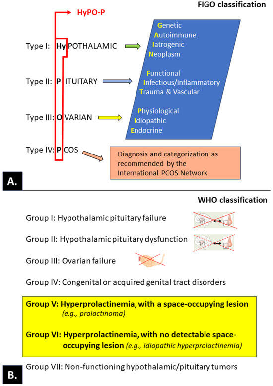 Classification of ovulatory disorders according to the International Federation of Gynecology and Obstetrics—FIGO (A) [] and the World Health Organization—WHO (B) [,]. The primary level of the FIGO system is based on an anatomic model (hypothalamus, pituitary, ovary) that is completed with a separate category for polycystic ovary syndrome (PCOS; the acronym HyPO-P). Each anatomic category is stratified in the second layer of the system to provide granularity for investigators, clinicians, and trainees using the “GAIN-FIT-PIE” mnemonic (genetic, autoimmune, iatrogenic, neoplasm; functional, infectious and inflammatory, trauma and vascular; physiological, idiopathic, endocrine). The tertiary level allows for specific diagnostic entities, including those related to PCOS.
