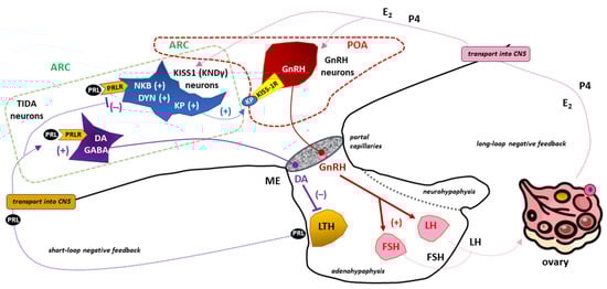 - Kokay, I.C.; Petersen, S.L.; Grattan, D.R. Identification of prolactin-sensitive GABA and kisspeptin neurons in regions of the rat hypothalamus involved in the control of fertility. Endocrinology 2011, 152, 526–535. [Google Scholar] [CrossRef] [PubMed]