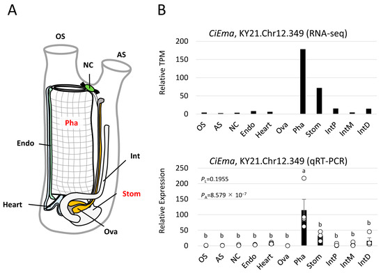 - Nakayama, S.; Ogasawara, M. Compartmentalized expression patterns of pancreatic- and gastric-related genes in the alimentary canal of the ascidian Ciona intestinalis: Evolutionary insights into the functional regionality of the gastrointestinal tract in Olfactores. Cell Tissue Res. 2017, 370, 113–128. [Google Scholar] [CrossRef] [PubMed]