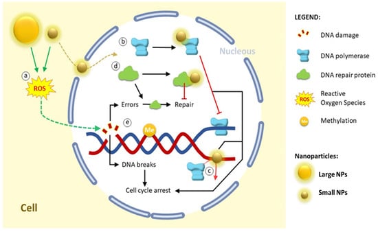 Effect of NPs with DNA. Internalization in the nucleus is size-dependent in general terms. (a) Large NPs cannot be internalized in the nucleus, although they can generate ROS and indirectly induce DNA damage. Small NPs can also generate ROS and can additionally be internalized and interact with nuclear proteins. (b) Interaction with DNA polymerase stops replication by inhibiting the interaction of DNA polymerase and DNA; and additionally, (c) NPs can bind to DNA and inhibit replication by blocking the binding of DNA polymerase and DNA. In cases where endogenous or exogenous DNA damage (NPs effect) is generated, this can be repaired by DNA damage repair proteins; however, (d) some NPs are able to interact with these repair proteins, blocking the repair process. These alterations lead to DNA damage accumulation and, as a consequence, cell cycle arrest; (e) additionally, several NPs can also modify the methylation profile (epigenetic alterations).