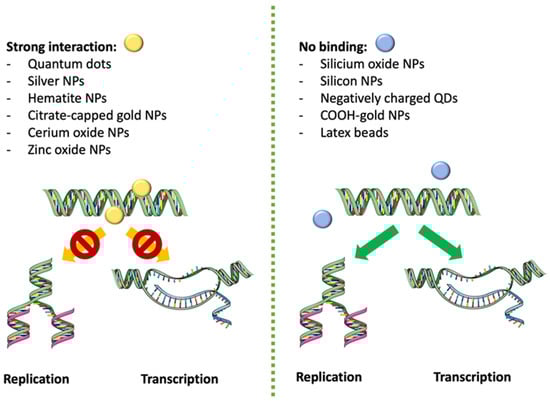 Effect of NPs on DNA functions according to interaction degree. Nanoparticles that strongly interact with DNA, as quantum dots (QDs), silver nanoparticles (Ag NPs), hematite NPs, citrate-capped gold nanoparticles (citrate Au NPs), cerium oxide nanoparticles (CeO2 NPs) and zinc oxide nanoparticles (ZnO NPs). They bind to DNA and inhibit the replication and transcription, whereas when there is no interaction (as for example with silicium oxide NPs, silicon NPs, negatively charged QDs, COOH-gold NPs and latex beads), replication and transcription are not altered.