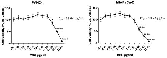 PANC-1 and MIAPaCa-2 PDAC cell lines and immortalized NCM460D and NHFA-12 cell lines were treated with different doses of CBG (up to 31.648 μg/mL) as single administration, and cell viability was determined by the MTT assay at 72 h post-treatment. The results showed that CBG reduces cell viability in both cell lines with an IC50 of 15.64 ± 0.83 μg/mL for PANC-1 and 13.77 ± 0.72 μg/mL for MIAPaCa-2 (Figure 1), while lower cytotoxicity was observed in normal human NCM460D and NHFA12 cell lines (Supplementary Figure S1). For the next experiments, we selected two doses of CBG (11.08 and 12.66 µg/mL), representing lower cytotoxic doses used for studying molecular and biological mechanisms in the PDAC cell lines with no cytotoxic effects on normal cells. CBG was always administered as a single dose.