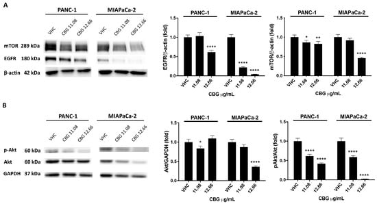 CBG treatment reduces EGFR and Akt/mTOR protein expression in PDAC cell lines. PDAC cell lines were treated with CBG, and the expression levels of mTOR and EGFR (A), Akt, and pAkt (B) were evaluated by Western blot at 48 h post-treatment. EGFR, Akt, and mTOR densitometric values were normalized to β-actin or glyceraldehyde-3-phosphate dehydrogenase (GAPDH), which were used as loading controls; pAkt densitometric values were normalized to Akt. Images are representative of one of three separate experiments. Data are expressed as mean ± SD of three separate experiments. * p < 0.05, ** p < 0.01, **** p < 0.0001 treated cells vs. VHC.
