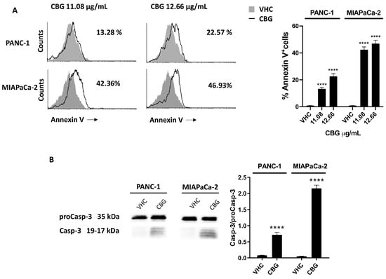To further investigate whether reduction of cell viability and activation of autophagy was associated with cell death, PANC-1 and MIAPaCa-2 cells were treated with 11.08 and 12.66 µg/mL of CBG, and Annexin V–FITC staining analysis were performed 48 h post-treatment. The results showed that CBG increases Annexin V+ cells in a dose-dependent mode (Figure 5A), suggesting the induction of apoptotic cell death. The activation of ProCaspase-3 (ProCasp-3) and the presence of the cleaved formed Caspase-3 (Casp-3) was investigated by Western blot analysis. Blots showed an increase in the Casp-3/ProCasp-3 ratio after 48 h post-treatment with CBG (12.66 µg/mL) in both cell lines (Figure 5B).