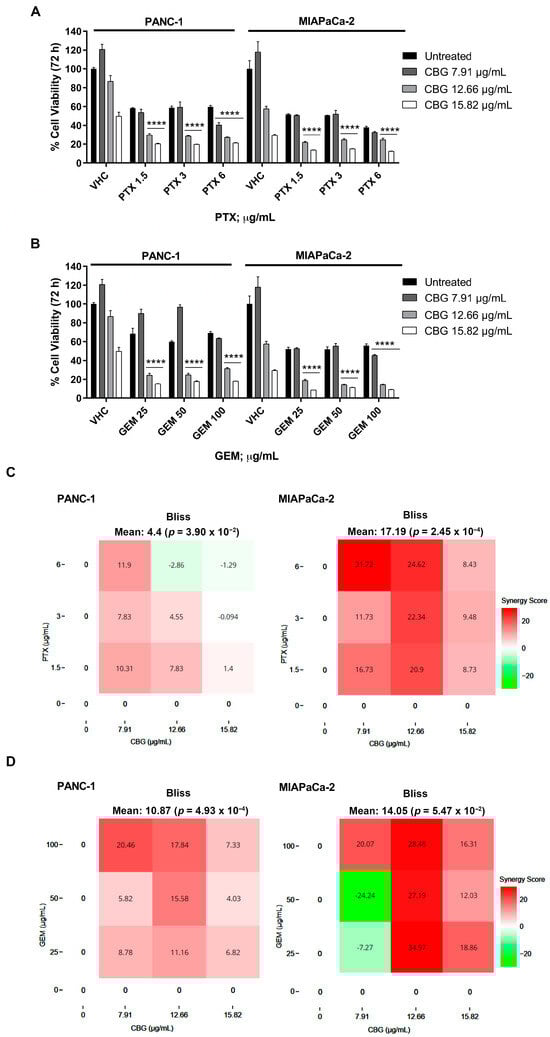 CBG increased the cytotoxic effect of chemotherapeutic drugs in PDAC cell lines. (A,B) Cell viability was determined in PDAC cell lines by MTT assay. Cells were treated for 72 h with CBG alone or in combination with different doses of GEM and PTX. Data shown are expressed as mean ± SD of three separate experiments. **** p < 0.0001 CBG combined with chemotherapeutic drug vs. chemotherapeutic drug alone. (C,D) Drug interaction of CBG with PTX and GEM in PDAC cell lines. Effect of single and combined treatments with CBG (7.91, 12.66, 15.82 µg/mL), PTX (1.5, 3, 6 µg/mL), and GEM (25, 50, 100 µg/mL) on cell viability of PDAC cell lines. Drug interaction was evaluated with SynergyFinder software using the Bliss model. Bliss synergy score larger than 10 is considered synergistic, a score from −10 to 10 is considered additive, and a score less than −10 is considered antagonistic.