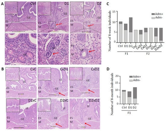 Histological analysis of uteri from 8-week-old F1 (exposed) females (Figure 1A) and their F2 offspring (Figure 1B) after HE staining showed the presence of nascent adenomyosis lesions (i.e., endometrial glands invaginated in the myometrium) in 3/9 (33%) F1-D1 and 7/12 (58%) F1-D2 uteri (Figure 1A,C). Adenomyotic foci were identified in the uterus of 2/6 (33%), 2/7 (28%), 4/7 (57%), and 6/7 (85%) F2 CxD1, F2 CxD2, F2 D2xC, and F2 D2xD2 females, respectively (Figure 1B,C). In control F1 (Ctrl) and F2 (CxC) females, the endometrium and myometrium layers were well demarcated (Figure 1A,B), and adenomyosis lesions were present only in 10% (n = 1/10) of F1, but not in F2 samples (Figure 1C).