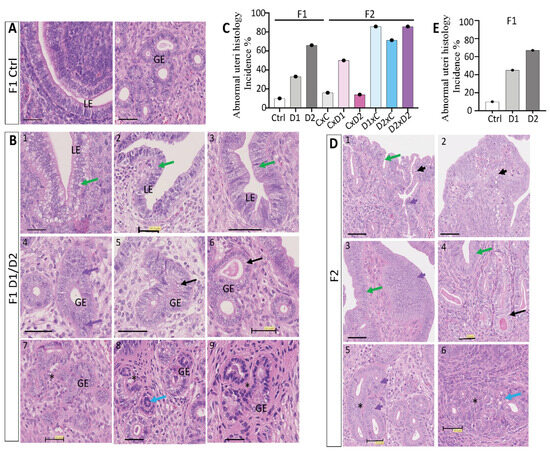 Abnormal histological features in the uterus of 8-week-old F1 and F2 females. Representative images of hematoxylin–eosin-stained paraffin-embedded uterus tissue sections of F1 control (A), F1 (B), and F2 (D) females. Scale bars: 50 μm. The following abnormal features were observed: clear cytoplasm, central nuclei, vacuolization, epithelial thickening (green arrows); dilated glands (black arrows); abnormal glands (blue arrows); proliferating glandular epithelium (GE) cells (purple arrows); hyperplasic luminal epithelium (LE)/GE (short purple arrows); apoptotic LE/GE cells (short black arrows) and gland nest formation (black stars). (C,E) Histograms showing the incidence (%) of abnormal features in the uterus of 8-week-old F1 and F2 (C) and in 8-month-old F1 (E) females.