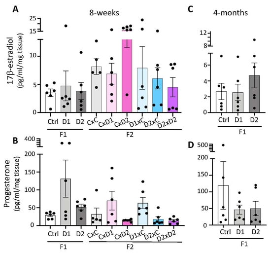 In 8-week-old females, steroid quantification showed that uterine E2 and P4 levels were not significantly different in F1 or F2 females and their respective controls (p > 0.05) (Figure 3A,B). However, the mean E2 concentration in the uterus of F2 CxD2 females tended to be higher (13.8 pg/mL) than in controls (8.1 ng/mL) and the mean P4 concentration tended to be higher in F1-D1 (131.5 pg/mL) and F1-D2 (55 pg/mL), in F2 CxD1 and F2 D1xC (69.9–63.5 pg/mL) females and tended to be lower in F2 CxD2, F2 D2xC and F2 D2xD2 (15 pg/mL) females than in controls (30 pg/mL). Similarly, in 4-month-old F1 animals, the mean E2 concentration in the uterus tended to be higher in F1-D2 (4.7 pg/mL) than in control females (2.6 ng/mL) (Figure 3C), and the mean P4 concentration tended to be lower in F1-D1 (46.3 pg/mL) and F1 D2 (50 pg/mL) than in control females (119.5 pg/mL) (Figure 3D).