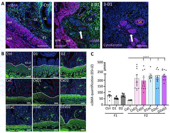 α-SMA expression in F1 and F2 uteri. (A) Representative immunofluorescence of α-SMA, FOXL2, and pan-cytokeratin expression in control uteri (1-Ctrl), and adenomyosis lesions in F1-D1 uteri (2-D1, 3-D1). LE: luminal epithelium; GE: glandular epithelium; ES: endometrial stroma; iml: inner myometrium layer; oml: outer myometrium layer. White arrow, adenomyosis lesion. (B) Representative immunofluorescence images of α-SMA expression (in green) in the uterus of 8-week-old F1 and F2 females; blue, nuclei stained with Hoechst dye. Scale bars: 100 μm (A,B). Green arrows, α-SMA expression in the endometrial stroma (ES)-junctional zone (JZ) compartments near the myometrium (M); The dashed white lines delineated the ES and M compartments. (C) Quantification of α-SMA staining in the ES-JZ compartments using the OMERO software; n = 2–3 sections per uterus, n = 4–7 per group (n = 4–12 regions of interest at the ES-JZ of a constant surface (30 mm2)). Data are the mean ± SEM, **** p < 0.001.