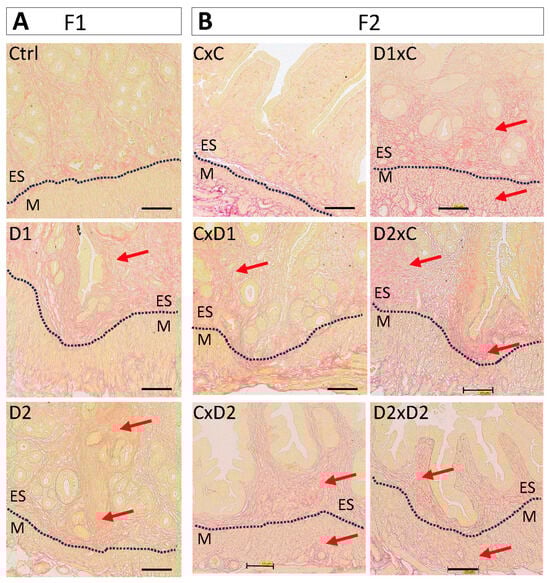 Representative images of uteri after Picrosirius red staining to show collagen fiber deposition (red arrows) in F1 (A) and F2 (B) female. Scale bars: 100 μm. Dashed black lines delineated the endometrium (ES) and myometrium (M).