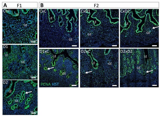 Cell proliferation was investigated by IF with an anti-PCNA antibody (proliferation marker). Proliferation of glandular epithelial cells was observed in the uterus of F1-D2 (Figure 6A) and F2 D1xC, D2xC, and D2xD2 females (Figure 6B), but not in control and F1-D1 females. Glandular cell proliferation could be due to the altered tissue organization in the surrounding stroma that affects the epithelial–stromal crosstalk.