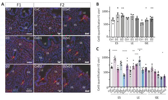 Cx43 (gap junction protein) expression and organization. (A) Paraffin-embedded uterus tissue sections of F1 and F2 females were stained with an anti-Cx43 antibody (red); nuclei were counterstained with Hoechst (HST; blue). Scale bars: 50 μm (F1 and F2 D1xC, D2xC and D2xD2) or 20 μm (F2 CxC, CxD1 and CxD2). ES: endometrial stroma; LE: luminal epithelium; GE: glandular epithelium. Red arrows indicate abnormal Cx43 expression in LE and GE. (B,C) Staining intensities of Cx43 were determined in n = 2–3 sections per uterus (n = 3–4 per group) (n = 4–10 ROIs per section) of ES (1500 μm2), LE (1000 μm2) and GE (700 μm2) (OMERO software). Data are the mean ± SEM, **** p < 0.001; *** p < 0.005; ** p < 0.01; * p < 0.05.