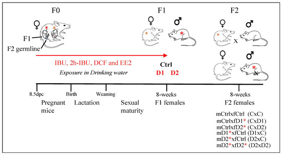 To generate F1 animals, CD-1 mice (F0) (Charles River Laboratories, Les Oncins, Saint Germain Nuelles, France) were mated, and pregnant F0 females were divided into three groups: control (no exposure, n = 6), mixture dose 1 (D1, n = 6), and mixture dose 2 (D2, n = 7) (Figure 8). Pregnant F0 females were exposed or not (control) to one of the two doses of the IBU, 2h-IBU, DCF, and EE2 mixture from 8.5 days post coitum (dpc) to birth, and then their F1 progeny was exposed to the same mixture up to adult age (8 weeks). This exposure time covered the main steps of migration, proliferation, and differentiation/maturation of germ cells and somatic cell lineages from the early embryonic stages until sexual maturity. The two doses in the drinking water were calculated based on their mean concentrations (D1: 5, 40, 10, and 1 ng/L, respectively) and maximum concentrations (D2: 50, 100, 50, and 20 ng/L, respectively) found in environmental drinking water samples (ANSES referral 2013-SA-0081) [78], as previously reported [52]. The control group was exposed to 0.001% ethanol (vehicle). Then, F1 exposed males (mD1, mD2) or females (fD1, fD2) were mated with control males (mCtrl) or females (fCtrl) or with D2 males (mD2) or females (fD2) to obtain F2 females (mCxfC, mCxfD1, mCxfD2, mD1xfC, mD2xfC, and mD2xfD2; n = 5–7 matings/group) (Figure 8). These mating combinations were simplified in the manuscript and named CxC, CxD1, CxD2, D1xC, D2xC, and D2xD2, respectively. For this study, animals were reared according to the protocols described previously [52,53]. All animal experiments were carried out in accordance with procedures approved by the Réseau des Animaleries de Montpellier (approval number 34-366 for B.B.-B. animal experimentation) and by the French regional ethics committee. Mice were euthanized by cervical dislocation in accordance with the recommendations for animal experiments. The 3R rule was respected throughout this project.
