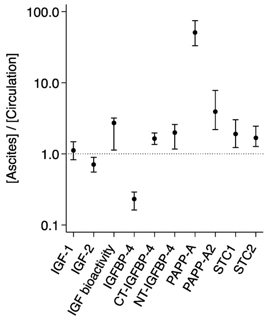 Distribution of IGF proteins in ascites and the circulation. Ratios ([Ascites]/[Circulation]) are based on measurements in 107 patients with ovarian cancer. For IGF bioactivity, intact IGFBP-4, CT- and NT-IGFBP-4, ratios are based on measurements in 20 patients. Ratio > 1 reflects a higher ascites level, and ratio < 1 reflects a higher level in the circulation. The horizontal line shows the level at which ascites = plasma. Ratios are median (25th percentile; 75th percentile) on a log scale. Differences between compartments were significant for all proteins. CT, C-terminal; IGF, insulin-like growth factor; IGFBP, IGF binding protein; NT, N-terminal; PAPP-A, pregnancy-associated plasma protein-A; STC, stanniocalcin.