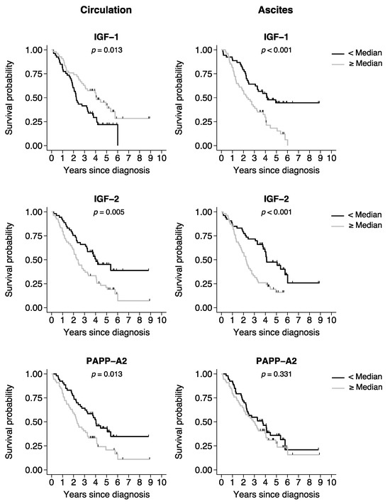 Kaplan–Meier curves of overall survival in patients with ovarian cancer. Kaplan–Meier survival curves were generated based on the median split of the protein levels in the circulation or ascites. Black line curves represent the group of patients with a protein level below the median. Gray line curves represent the patients with a protein level above the median. p-values: log-rank test for survival equality in the two groups. Tick marks represent censored events. IGF, insulin-like growth factor; PAPP-A2, pregnancy-associated plasma protein-A2.