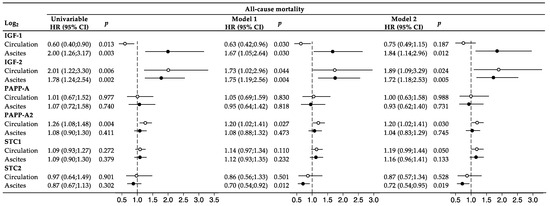 Cox regression analysis and forest plot. The IGF system markers were investigated both in univariable analyses and in multivariable analyses. Model 1: adjusted for age, tumor stage, and macro-radical tumor removal. Model 2: adjusted for covariables in model 1 + CCI and performance score. The IGF variables were log2-transformed, and accordingly, one unit increase on the log2-scale corresponded to a doubling in protein. Forest plots display HR (95% CI), with hollow circles referring to circulating levels and solid circles referring to ascites levels. The vertical dashed lines represent the points of no effect (HR = 1.00). CI, confidence interval; HR, hazard ratio; IGF, insulin-like growth factor; PAPP-A, pregnancy-associated; STC, stanniocalcin.