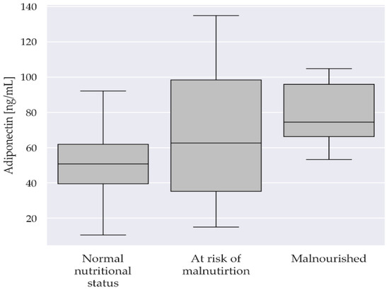 Post hoc tests showed differences in adiponectin concentration between the group of patients with normal nutritional levels and the group of malnourished patients (p = 0.004). No significant differences were found between the group of patients with normal nutritional status and those at risk of malnutrition (p = 0.392) and between patients at risk of malnutrition and patients with malnutrition (p = 1.000). The distributions of adiponectin measurement values in the groups are presented in Figure 1.
