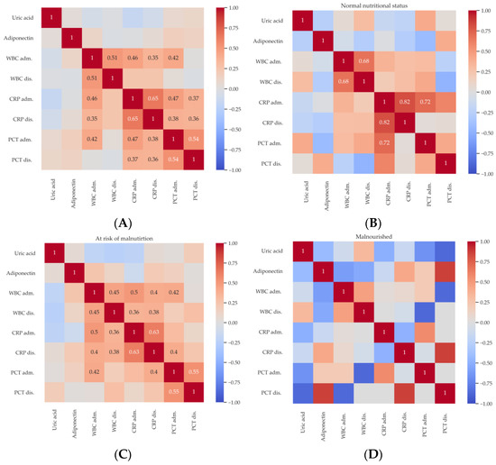 For patients at risk of malnutrition, significant correlations were found at the 0.05 significance level between WBC upon admittance and WBC at discharge (R = 0.45), CRP on admission (R = 0.5), CRP at discharge (R = 0.4), and PCT upon admittance (R = 0.42). In addition, WBC at discharge is statistically significantly correlated with CRP on admission and at discharge (R = 0.36 and R = 0.38, respectively). CRP at the time of hospital admission is significantly correlated with CRP at discharge (R = 0.63). CRP at discharge is statistically significantly correlated with PCT on admission (R = 0.4). Finally, PCT on admission is correlated with PCT at discharge (R = 0.55). (Figure 2C). Interestingly, there were no statistically significant correlations for biomarkers tested in malnourished patients (Figure 2D).