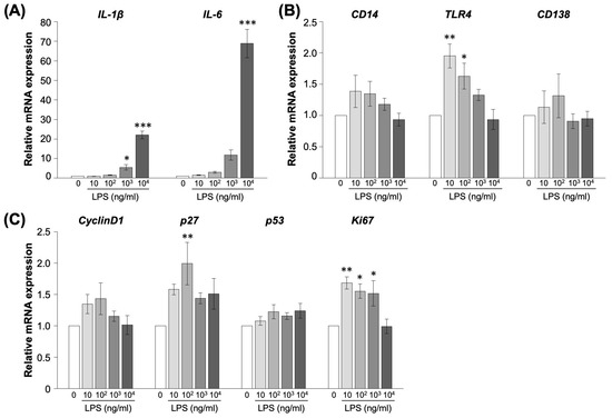 Gene expression of inflammatory and cells cycle markers in EM-E6/E7/hTERT-2 cells. The cells were administrated LPS (0, 10, 102, 103 and 104 ng/mL) for 4 h. The experiments were conducted more than twice. (A,B) Inflammatory markers: IL-1β, IL-6, CD14, TLR4 and CD138. (C) Proliferation markers: CyclinD1, p27, p53 and Ki67. Values are showed as mean ± SEM, * p < 0.05, ** p < 0.01, *** p < 0.005.
