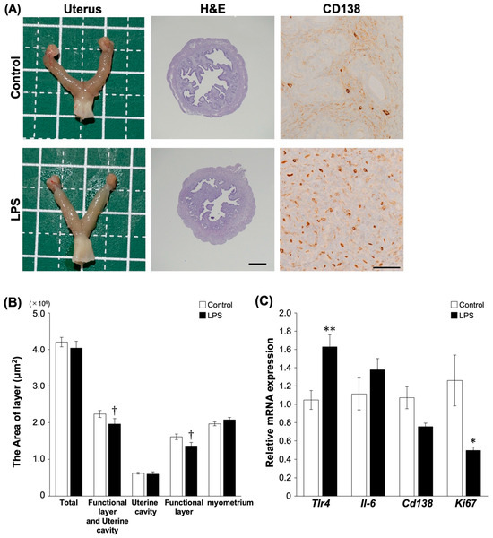 Furthermore, to examine whether LPS affects the mechanism of inflammation and proliferation in vivo, we performed an experiment using a mouse model of the inflammatory environment of the uterus. The chronic inflammatory condition in mice was consecutively induced by administering LPS (1 mg/mL) once a week for 2 weeks. After a week, the samples were collected and analyzed for inflammation. LPS-injected mice showed no significant differences in physiology, including body weight (BW) and LPS concentrations in plasma and uterine supernatants, compared to controls (Figure S2A,B). Additionally, no hyperemia or histological lesions were observed in the uterus post-LPS injection (Figure 3A and Figure S3). The IHC staining of CD138, which is utilized for the diagnosis of CE, demonstrated conspicuous positive signals in the endometrium of the group of mice administered with LPS in the mouse uterus (Figure 3A). The overall area, including the uterine cavity, did not differ between the control and LPS groups (p = 0.13). However, a trend of decrease was indicated in the functional layer area, including the functional layer within the uterine cavity, in the LPS group compared to the control group (p < 0.1, Figure 3B). LPS stimulation increased the expression of Tlr4 in mouse uterus compared to the controls (p < 0.05, Figure 3C). The expression of Ki67, which is a proliferation marker, was significantly lower in the LPS group than in the control group (p < 0.05). LPS did not alter the expression level of Il-6 and CD138 (p = 0.25, p = 0.12). Although the IHC staining of CD138 observed clearly increased the signal of CD138-positive cells, there was no discernible difference in the gene expression of CD138 in uterine tissues between the LPS group and the control group. Despite the detected positive signal in the IHC staining due to LPS stimulation in the mouse uterus, distinguishing the gene expression of CD138 between the LPS group and the control group proved challenging. Furthermore, the group of LPS stimulation into the uterine exhibited a tendency toward reducing the functional layer in the endometrium and the decrease in the gene expression of Ki67 compared to the control group. These findings indicate a disruption in the normalcy of the endometrium, highlighting the impact of consecutively induced inflammatory conditions in the CE mouse model.