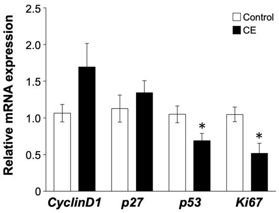 Gene expression of cell cycle markers (CyclinD1, p27, p53, Ki67) in human endometrial tissue. Comparison of gene expression between controls (n = 10) and CE patients (n = 13). The experiments were conducted once, utilizing uterine endometrial tissue samples from each patient. Values are shown as mean ± SEM and * p < 0.05.
