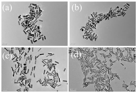 TEM images of GNRs with aspect ratios of (a) 3.39 (GNR-1), (b) 3.54 (GNR-2), (c) 4.19 (GNR-3), (d) 5.42 (GNR-4).