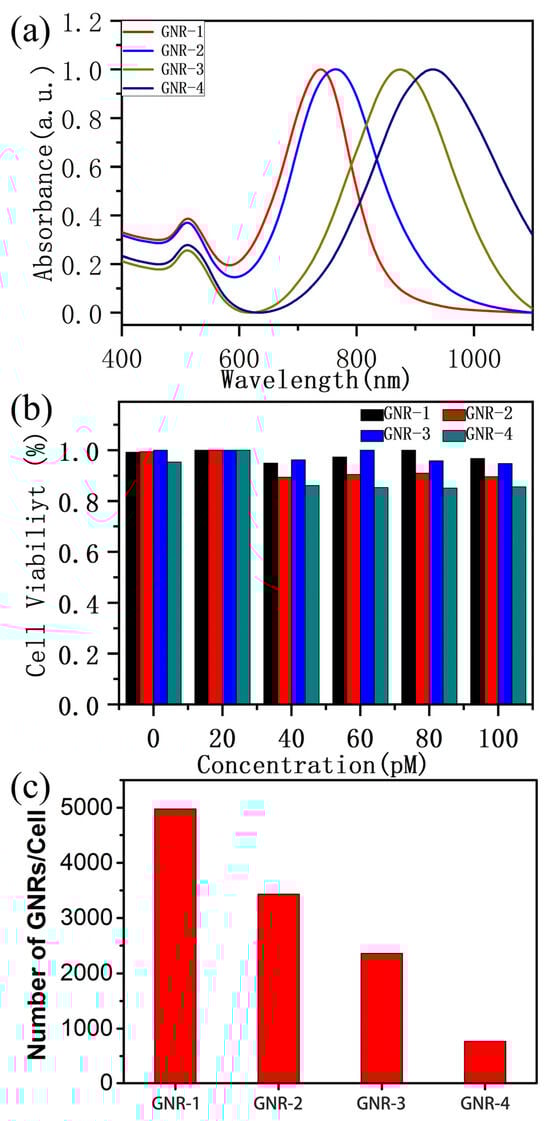 (a) The normalized UV-vis absorbance spectra of GNR-1, GNR-2, GNR-3, GNR-4. (b) Viability of HepG2 cells incubated with GNR-1, GNR-2, GNR-3, GNR-4 of different concentrations after 24 h. (c) The average amount of GNR-1, GNR-2, GNR-3, GNR-4 uptake by HepG2.