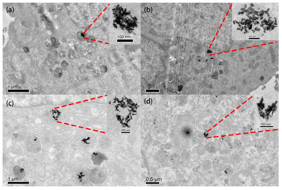 TEM images of GNR-loaded HepG2 cells (without fs laser irradiation). (a) GNR-1. (b) GNR-2. (c) GNR-3. (d) GNR-4. The inset images at the top right show a zoomed-in view of GNR clusters in cell vesicles.