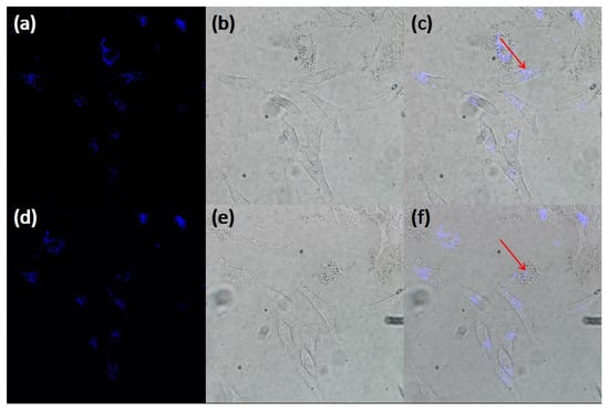 GNR-1 incubated with HepG2 cell 24 h, before photothermal therapy using 742 nm laser, (a) the two-photon fluorescence images and (b) bright-field images, (c) the overlap of (a,b). After photothermal therapy using 742 nm laser, (d) the two-photon fluorescence images and (e) bright-field images, (f) the overlap of (d,e). The red arrow points to the therapy site. The images are taken with 60× objective.