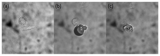 Using 742 nm laser to excite GNR-1 in HepG2 cell for photothermal therapy. (a) Before, (b) during, (c) after the therapy process. The images are taken with 60× objective.