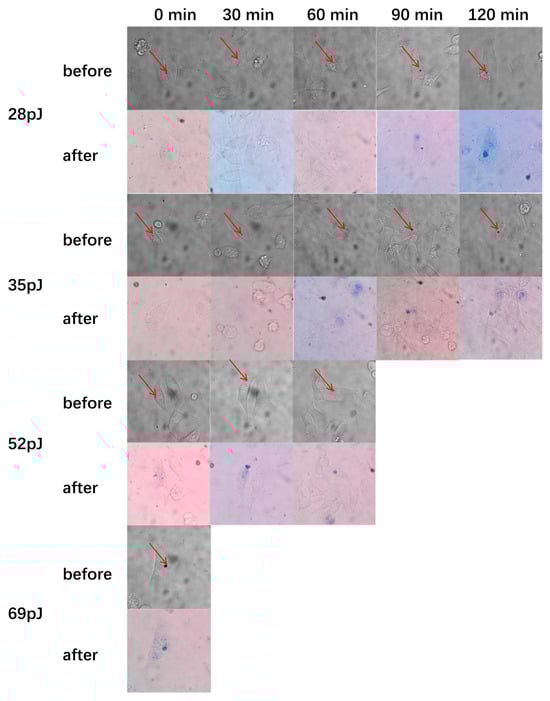 In order to avoid cell necrosis caused by high laser power and subsequent inflammation of nearby tissues, photothermal treatment with different laser power to induce cancer cell death has also been studied to achieve the purpose of inducing cell death with low power. After incubation of GNR-1 with HepG2 cells for 24 h, the cells are exposed to a focused 780 nm laser of different power for 20 s. Trypan blue dye is used to determine whether cells died. If the cells are dead, trypan blue dye could enter the nucleus and stain it blue. Figure 6 shows cell images before and after laser treatment. As can be seen from Figure 6, cells treated with a high-power laser die immediately, while those treated with a low-power laser die after a certain period of time. When the input laser power is 28 pJ (measured before entering the microscope), the cells die after being treated for 120 min. HepG2 cells die immediately after 20 s of irradiation with a laser pulse energy of 69 pJ. These results indicate that the time interval between photothermal treatment and cell death decreases with the increase in laser power.