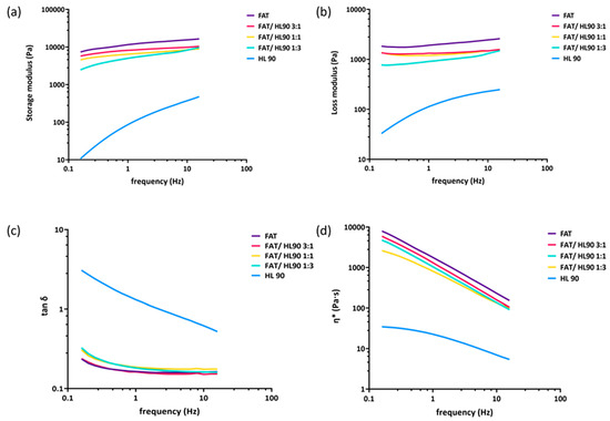 The results of the rheological measurements are shown in Figure 1. The storage modulus (Figure 1a), the loss modulus (Figure 1b), the complex viscosity (Figure 1c), and the tan δ (Figure 1d) of all the combinations of HL 90 with adipose tissue investigated were reported as a function of frequency in the range 0.159–15.9 Hz. The curves presented here were obtained by averaging all the rheological data achieved for each sample with at least three measurements.