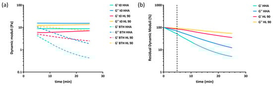 Reduction in storage and loss moduli during 25 min of incubation with BTH 10 U/mL for the formulations. G′ and G″ as a function of time recorded for the samples in the presence of the enzyme. Values measured during incubation with PBS under the same experimental conditions (control) were also reported. All measurements were carried out at 37 °C, 2.5 Hz of frequency, and 2% of strain. (a) Residual G′ and G″ as a function of time in 25 min incubation with BTH (b). The vertical dashed line separates the extrapolated values (on the left) from the data obtained by performing rheological measurements (on the right).
