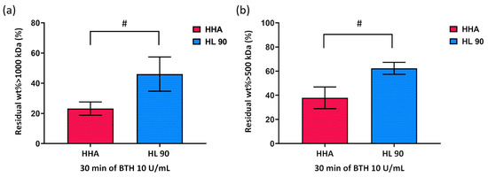 Weight fraction with molecular weight above 1000 kDa (a) and 5000 kDa (b) residue (%) after 30 min of incubation with BTH 10 U/mL. A t-test was used to compare the significance of the parameters of HL 90 with respect to HHA (# p < 0.05).