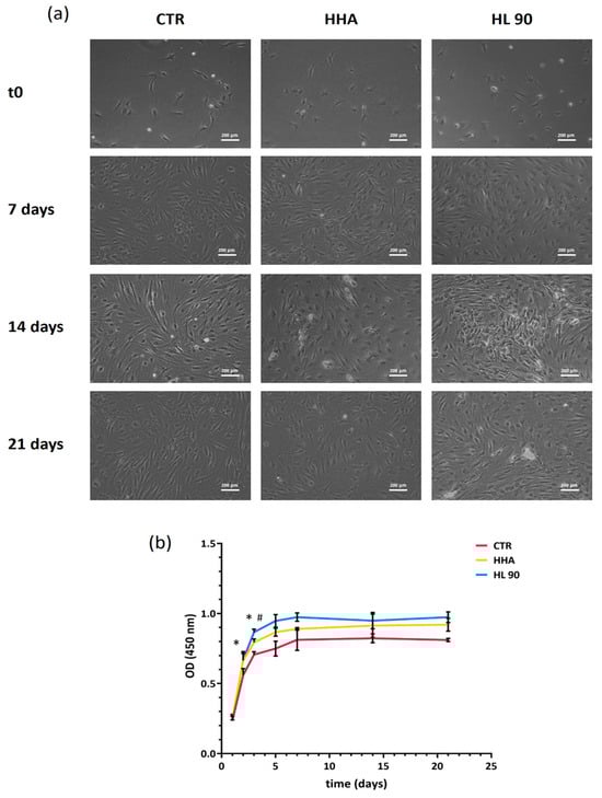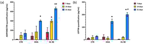ELISA assay relative to ADP (a) and LP (b) after 7, 14, and 21 days of in vitro culture. Data are reported as mean ± SD; t-test was used to compare the significance of each treatment with respect to CTR (* p < 0.05) and HL 90 vs. HHA (# p < 0.05).