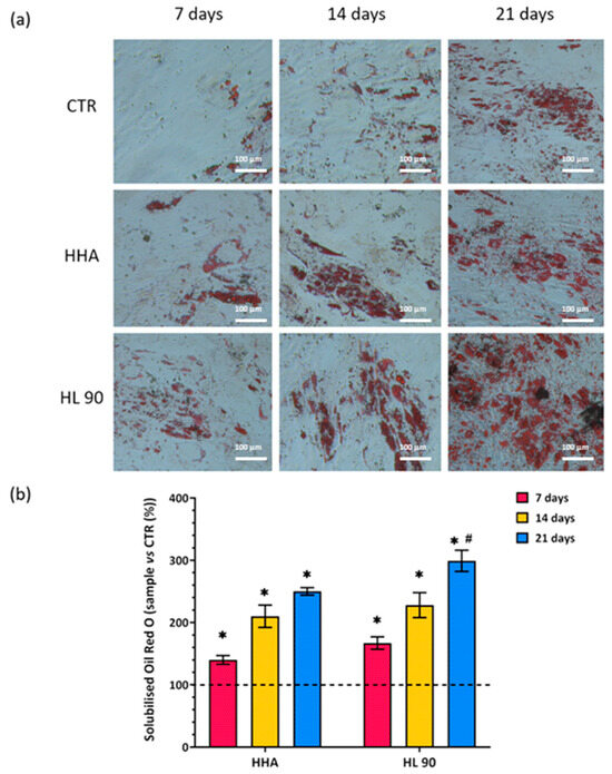 Oil Red O staining assay performed after 7, 14, and 21 days of in vitro culture. Pictures of cells within the assay, scale bar 100 μm, 20× magnification (a); solubilized Oil Red O (samples vs. CTR (%)) Dashed line present in the graph is related to untreated cells (CTR) (b). Results are presented as mean ± SD; t-test was used to compare the significance of each treatment with respect to CTR (* p < 0.05) and HL 90 vs. HHA (# p < 0.05).