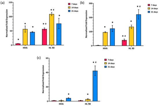 The quantitative real-time polymerase chain reaction (qRT-PCR) outcomes showed that the HA-based products were able to sustain the differentiation of hASCs versus adipose phenotype through the gene modulation of all the biomarkers selected in this study. Being an early adipogenic enhancer, the PPAR-γ gene expression was upregulated within 7 and 14 days, while it decreased after 21 days in the in vitro culture in the presence of the tested hydrogels. In detail, the PPAR-γ gene expression increased in comparison to CTR after 7 days. It seemed that the central/turning point of the differentiation process was reached at 14 days with an upregulation of about 56- and 108-fold vs. CTR in the presence of HHA and HL 90, respectively (Figure 6a). Both at 7 and 14 days of treatment, PPAR-γ in the presence of HL 90 was significantly (p < 0.05) higher than HHA. On the other hand, the modulation trend of adiponectin (ADP) and leptin (LP) was different with a progressive increase within that time. In fact, the ADP expression level prompted starting from 14 days with an increase of about 96-fold vs. CTR with HHA alone and 134-fold vs. CTR with the HA hybrid complex (45 mg/mL). Figure 6b shows a further increase in this biomarker, specifically of about 121- and 221-fold vs. CTR after 21 days of incubation with HHA and HL 90, respectively, with a significant difference (p < 0.05) between the samples. Finally, the LP gene expression was also shown to be most enhanced after 21 days in the in vitro culture in the presence of the linear HA (5-fold vs. CTR) and the HL 90 (p < 0.05) (42-fold vs. CTR) (Figure 6c). For this biomarker, the gene modulation effect in the presence of HL 90 was significantly different (p < 0.05) from HHA after 21 days.