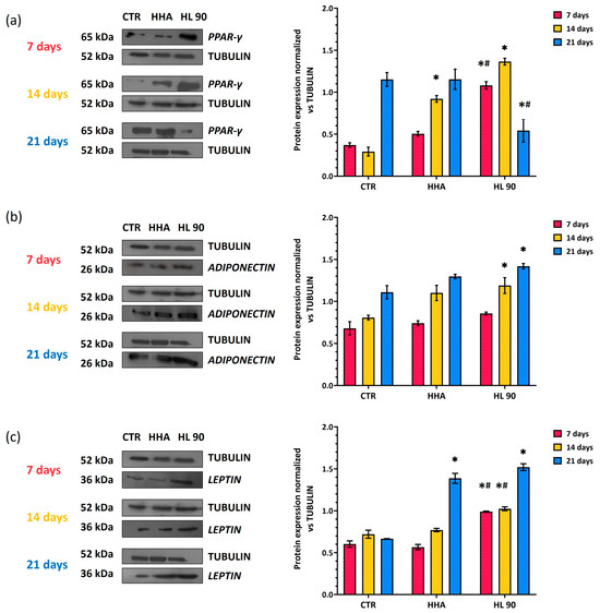 Expression levels evaluation by WB of protein related to the adipogenic differentiation; PPAR-γ (a), ADP (b), and LP (c) in hASCs grown in vitro for 7, 14, and 21 days in presence of HHA or HL 90. Densitometric analyses were performed normalizing each protein expression with respect to tubulin. Data are presented as mean ± SD. t-test was used to compare the significance of each treatment with respect to CTR (* p < 0.05) and HL 90 vs. HHA (# p < 0.05).